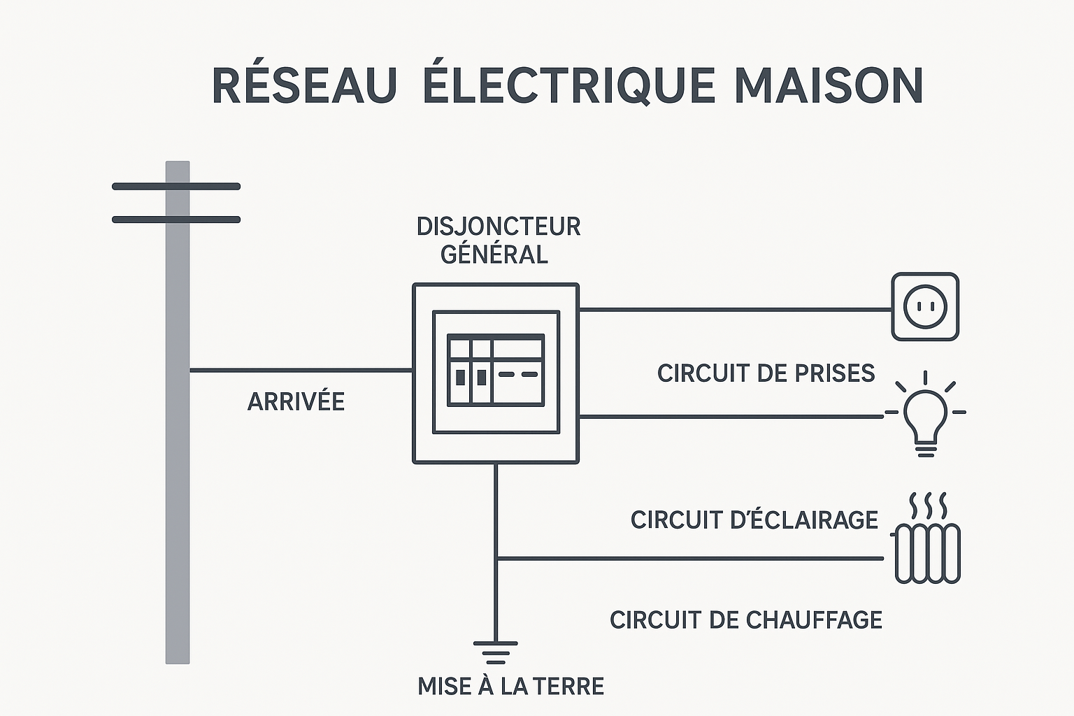 Diagramme global d’un réseau domestique avec tableau principal, disjoncteur général, circuits de prises, circuits lumière, mise à la terre.